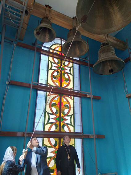 Отец Александр провёл участников Форума на колокольню, где каждый смог ударить в главный колокол, возвещая начало доброго дела на священной земле Луганщины. А слышно этот колокольный звон было по всей Руси Великой.