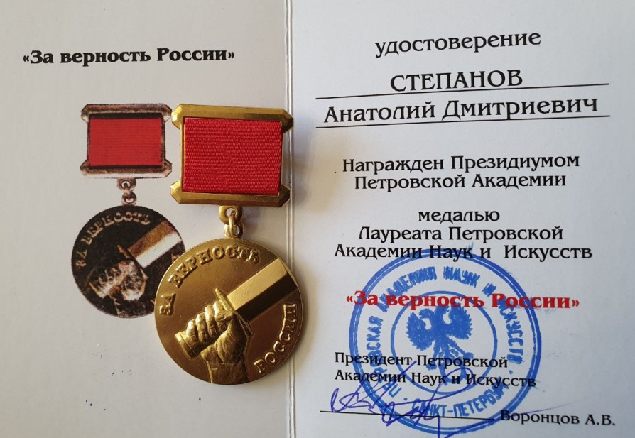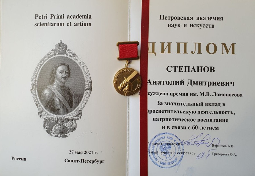 В конце своего выступления А.В. Воронцов вручил главному редактору информагентства «Русская народная линия», член-корреспонденту ПАНИ Анатолию Степанову диплом о награждении премией ПАНИ им. М.В. Ломоносова за большие заслуги в просветительской, патриотической деятельности и в связи с 60-летием.