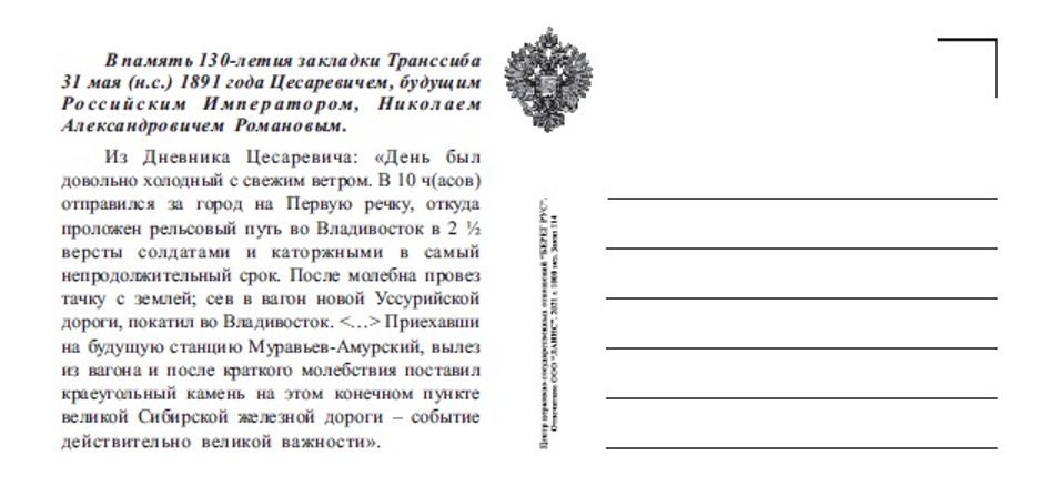 На открытке «Владивосток. Начало Транссиба» размещен известный портрет Наследника Престола в парадном мундире. Слева от образа – современное отреставрированное здание железнодорожного вокзала Владивостока, закладку которого осуществил Цесаревич Николай Александрович Романов. Рядом с вокзалом – паровоз с вагонами, идущий по рельсам Транссиба. Открытка указывает на географическое начало Великого Сибирского рельсового пути во Владивостоке, и начало хронологическое – 31 мая (н.с.) 1891 года.