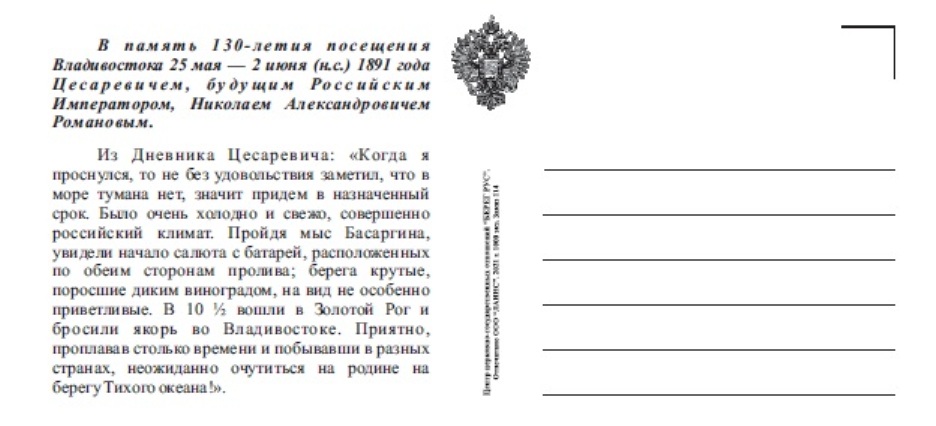 Во Владивостоке Центром церковно-государственных отношений «Берег Рус» изданы памятные открытки, посвященные 130-летнему юбилею Восточного путешествия Цесаревича, будущего Российского Императора Николая Александровича Романова. С 25 мая по 2 июня (н.с.) 1891 года Государь посещал Владивосток и благословил город у Океана, назвав его в своих дневниковых записях «великим портом будущего». Во Владивостоке, по распоряжению своего отца Царя Александра III, Николай Александрович заложил начало Великого Сибирского рельсового пути и совершил много славных дел по утверждению России и Церкви на тихоокеанском берегу. В память о тех славных Царских днях во Владивостоке отпечатаны на дорогой плотной бумаге открытки «Владивосток встречает Цесаревича» и «Владивосток. Начало Транссиба».