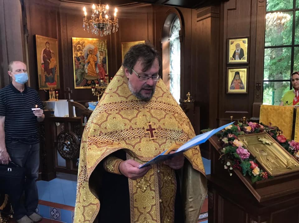 Дождь внезапно закончился. Началось отпевание во главе с о. Александром Пелиным. Атмосфера в маленьком храме была благоговейной. По окончанию отпевания о. Александр зачитал послание соболезнования от митрополита Санкт-Петербургского Варсонофия.