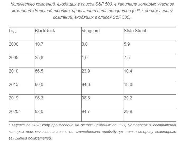 «Как видно из табл. 1, с 2000 года компании "Большой тройки" стремительно распространяли своё влияние на крупный бизнес Америки, - отмечает профессор. - Еще в 2000 году компания Vanguard не имела ни в одной компании из списка S&P 500 крупных пакетов акций, она участвовала в капиталах некоторых компаний лишь в качестве миноритарного акционера. А к концу рассматриваемого периода (2000-2020) Vanguard участвовала в капиталах подавляющей части всех компаний из списка S&P 500, обойдя не только State Street, но и BlackRock.