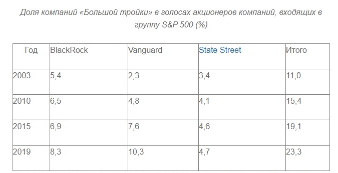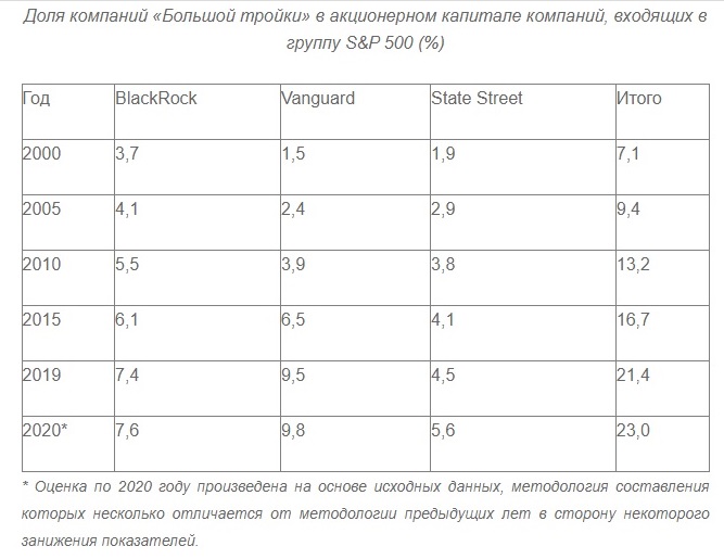Авторы статьи рассчитали и такой показатель, как доля компаний «Большой тройки» в акционерном капитале всей группы компаний S&P 500 (табл. 2)».