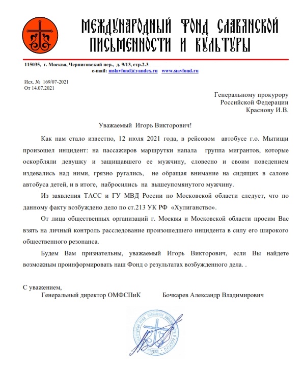 Тем временем генеральный директор Международного Фонда славянской письменности и культуры Александр Владимирович Бочкарёв направил обращение Генеральному Прокурору России И.В.Краснову и начальнику ГУ МВД по Московской области генерал-лейтенанту В.К.Паукову по факту хулиганской выходки мигрантов в рейсовом автобусе в г. Мытищи.