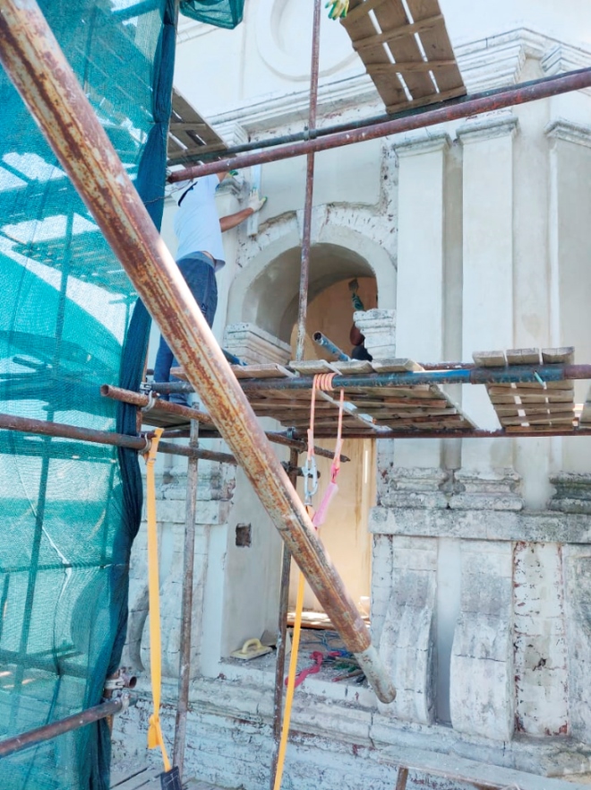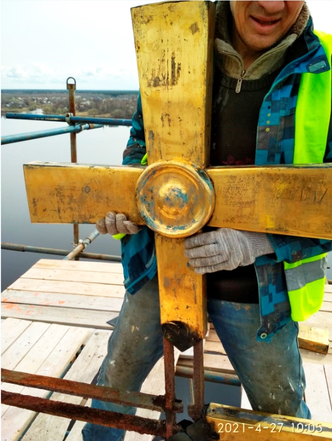 Однако и эта, наиболее важная, яркая часть памятника, будет подлечена! Специалисты уже провели работы по очистке, реставрации поверхности, грунтовке и золочению сусальным золотом, восстановили утраченные детали и элементы, украшающие крест. В ближайшие дни планируется провести чин церковного освящения креста, и после работ по монтажу кровли шпиля крест будет установлен на колокольню.
