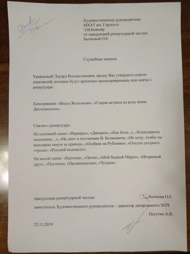 1. К руководству МХАТ им. М. Горького пришли непрофессиональные люди, не имеющие профильного образования, с компетенциями, не соответствующими традициям, масштабу и истории МХАТа.