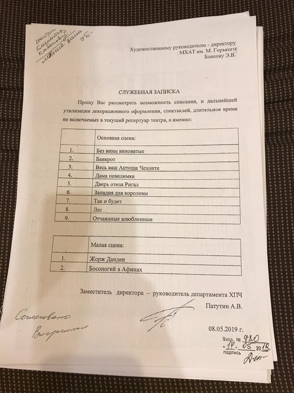 4. Действия нового художественного руководства МХАТа в части репертуарной политики направлены на дискредитацию и забвение образа Президента МХАТа нар. арт. СССР Т.В. Дорониной (прилагаем фотофиксацию разрушения фотовыставки, посвященной Т. В. Дорониной, служебные записки о снятии, консервации и утилизации спектаклей, некоторые из которых успешно шли на сцене Театра).