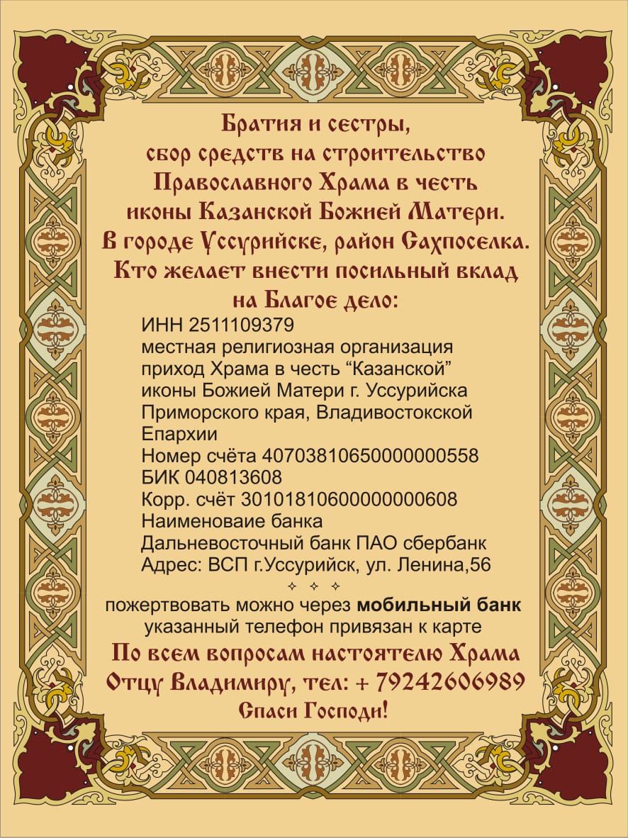 Дорогие братья и сестры, сыны и дочери нашего славного Отечества, помогите в строительстве Казанского храма в Никольск-Уссурийском, в городе, охраняющем восточные пределы России!