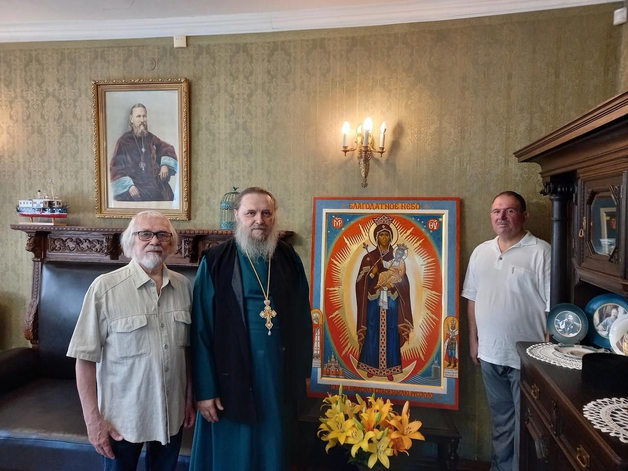 Принесение иконы Благодатное Небо для Русского Севера в Мемориальную Квартиру св.Иоанна Кронштадтского. 15 июля 2021 года. Иконописец Ростислав Гирвель, протоиерей Геннадий Беловолов, Михаил Юрченко