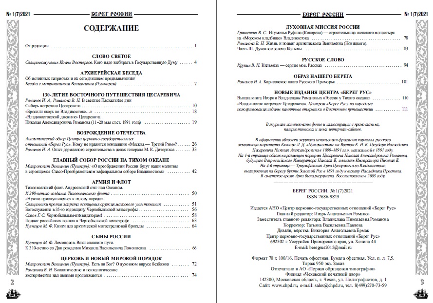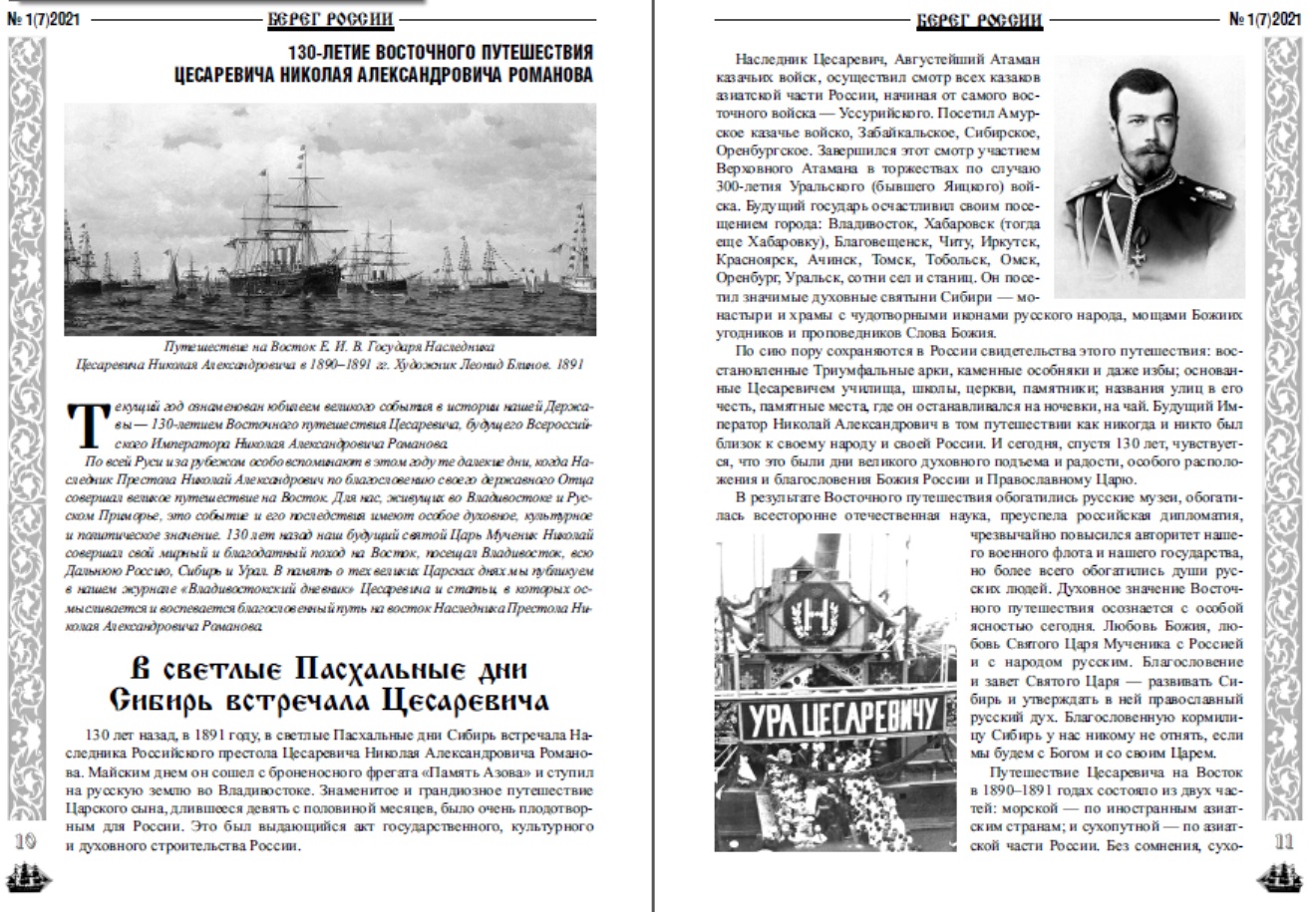 Одной из ключевых тем номера является Восточное путешествие Цесаревича, будущего Российского Императора Николая Александровича. 130-летие этого великого события Россия и весь мир отмечают в нынешнем году. Среди опубликованных материалов, посвященных Восточному путешествию, большую ценность представляет «Владивостокский дневник» Цесаревича – записи, сделанные в 1891 году самим Государем Наследником, расшифрованные в 2016 году в Госархиве РФ российским историком и писателем Андреем Юрьевичем Хвалиным и предоставленные для публикации «Берегу России».