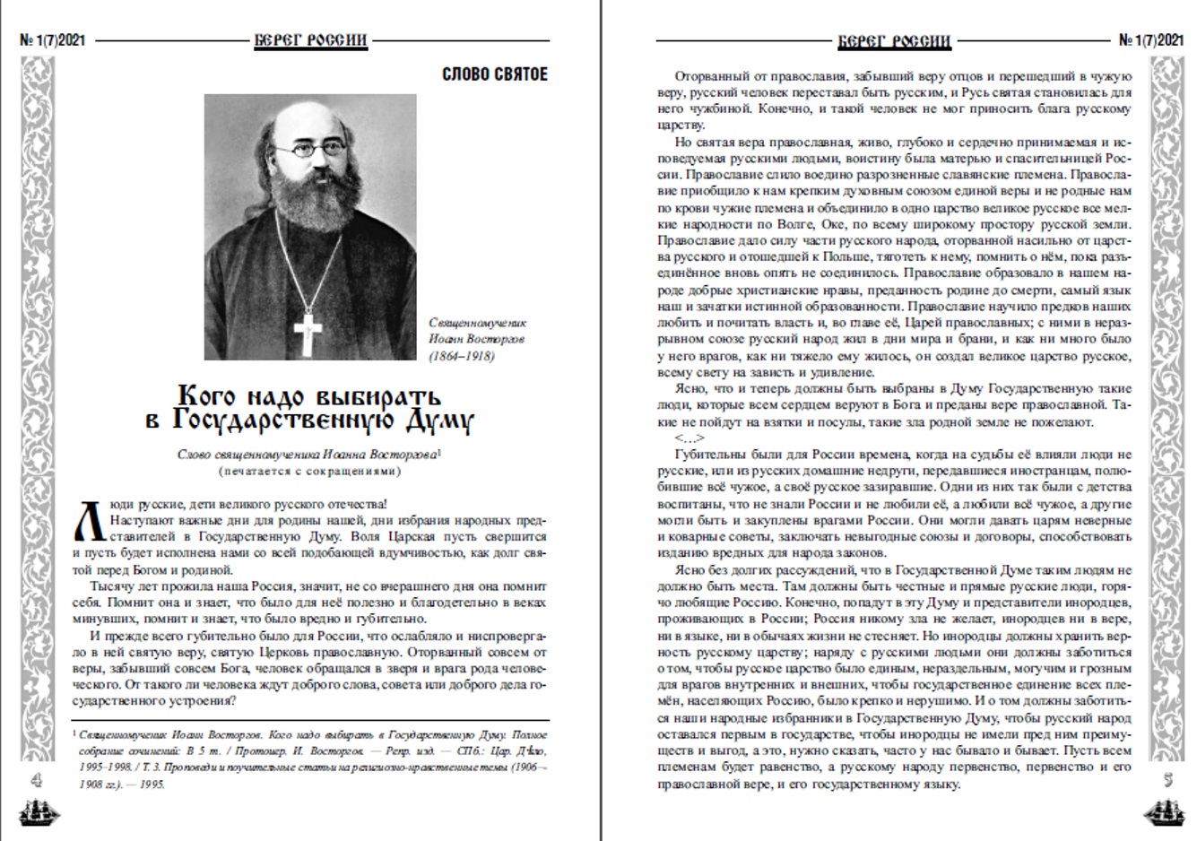 «Сейчас, занятые проектами воцарения нового мирового порядка, многие во власти и обществе забыли об истинных задачах России – Третьего Рима. Забыли о том, что завещали нам Великий князь Владимир Красное Солнышко и святой Царь-мученик Николай, благословивший миссионерский путь Руси на восток. И об этом вряд ли напомнят нам политические партии, которые в наступающем сентябре вступят в тяжелую борьбу за места в Государственной Думе… Нам самим нужно глубже вглядываться в свою жизнь и в историю своего народа, стремясь разглядеть там действие Промысла Божьего», - говорится в редакционном Слове нового выпуска журнала «Берег России».