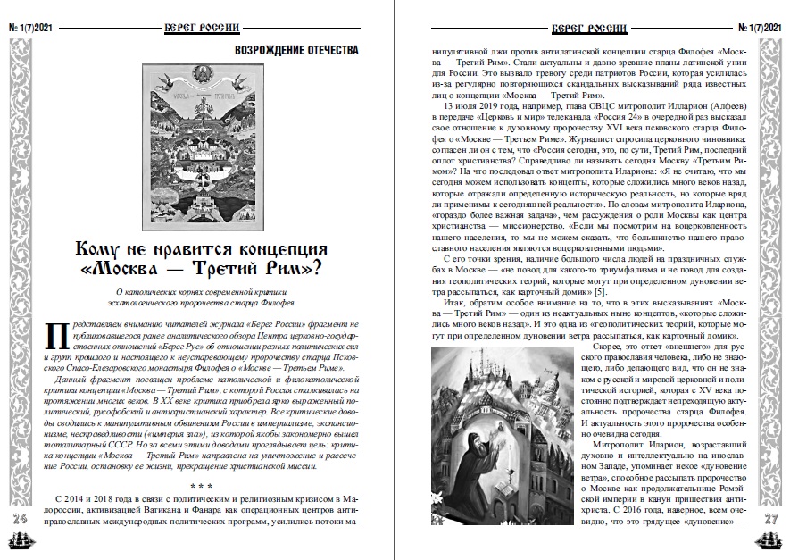 «Москва – Третий Рим» – это вечная идея существования России. В журнале представлена часть большого аналитического обзора Центра церковно-государственных отношений «Берег Рус», названная «Кому не нравится концепция "Москва – Третий Рим"?». В публикации дан ответ на филокатолические негативные и грубые отзывы об этой концепции от епископов Константинопольского патриархата и сотрудников ОВЦС.