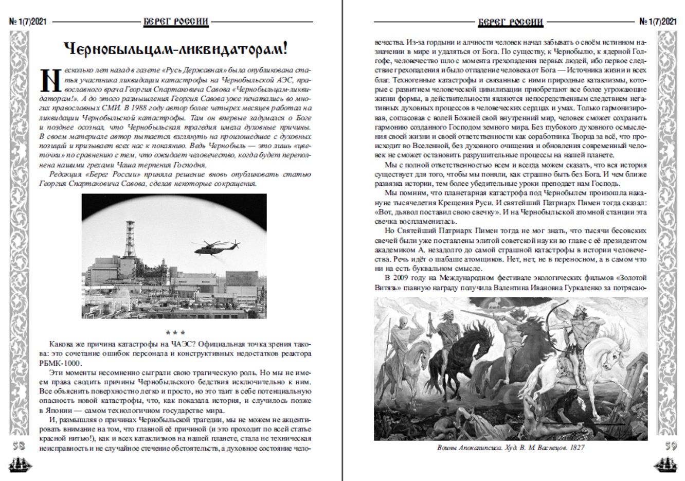 Часть рубрики «Армия и флот» посвящена Подвигу наших воинов, ликвидаторов последствий Чернобыльский аварии, произошедшей 35 лет назад. Представлен духовный взгляд на страшные события тех лет.