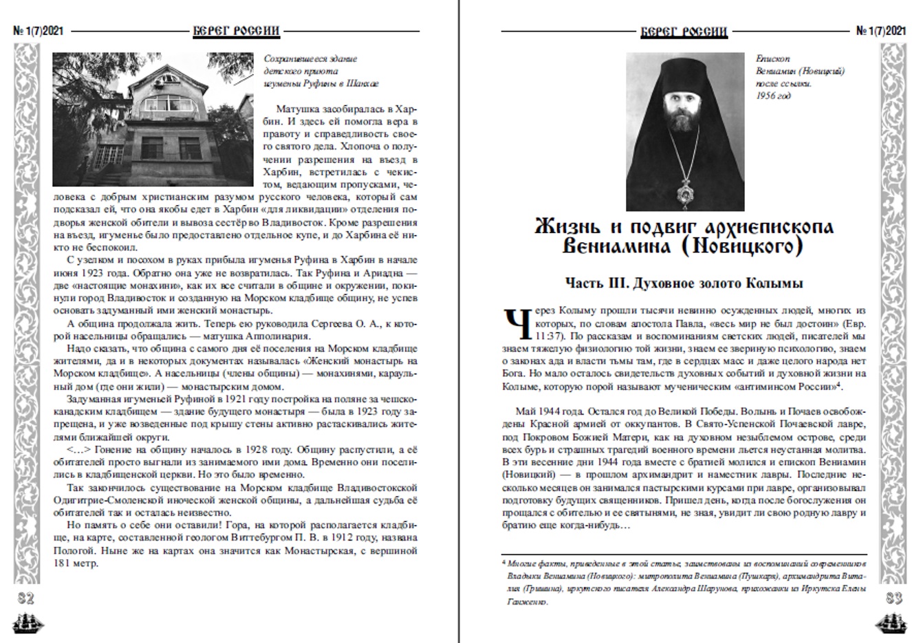 В новом выпуске журнала опубликована третья часть большой работы Владиславы Романовой о выдающемся архиерее Русской Церкви архиепископе Вениамине (Новицком). Очерк «Духовное золото Колымы» посвящен истории ссылки почаевского епископа в Севвостлаг. Предыдущие две части очерка, судя по отзывам, поступившим в редакцию журнала, вызвали интерес среди специалистов по церковной истории и многих православных читателей.