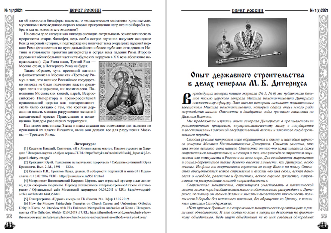 Как сегодня воплотить идеал Святой Руси? Как России во всей полноте вновь стать Третьим Римом? Некоторые практические «наработки» в этом направлении дает нам опыт державного строительства царского генерала Михаила Константиновича Дитерихса в 1920-е годы на Дальневосточной окраине России. Об этом в исследованиях авторов журнала.