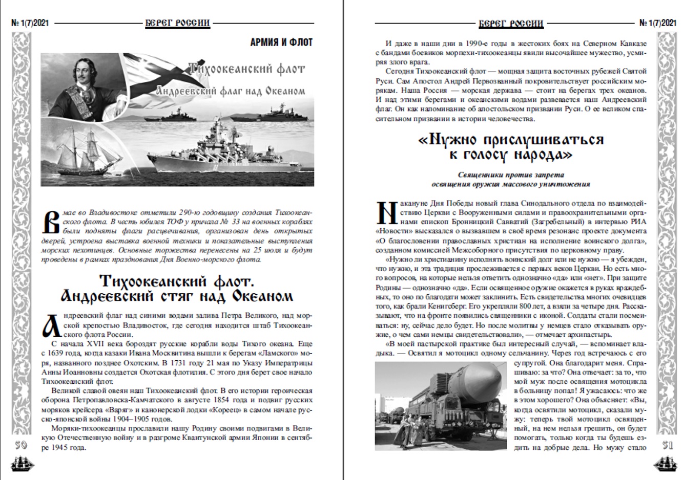 «Армия и флот» - традиционная рубрика журнала «Берег России» - напоминает нам о 290-летнем юбилее Тихоокеанского флота. В рубрике также представлена дискуссия об освящении Церковью оружия массового поражения. В дискуссии авторитетные архиереи, священники Русской Церкви однозначно высказываются о необходимости освящения оружия массового поражения.