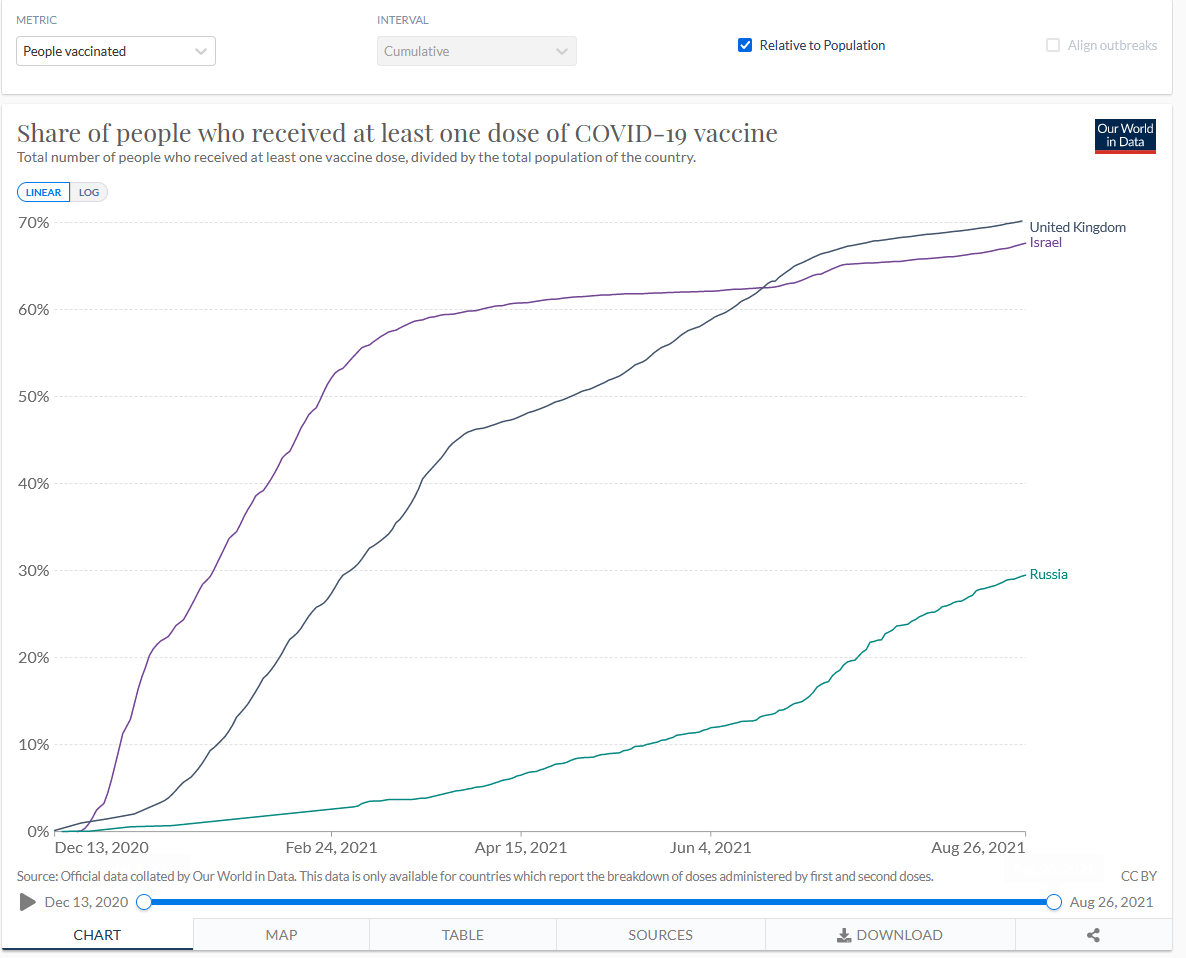 Вакцина была доступна уже в декабре, хотя и в небольшом количестве. В январе-феврале прививка была доступна в любом регионе. Таким образом, уже к марту при должной организованности мы могли бы достичь уровня вакцинации не менее израильской. Я тут опускаю вопрос о количестве произведённой вакцины, всё-таки я думаю, что если бы был большой спрос, был бы и большой выпуск, в крайнем случае, задержка составляла бы ещё месяц.