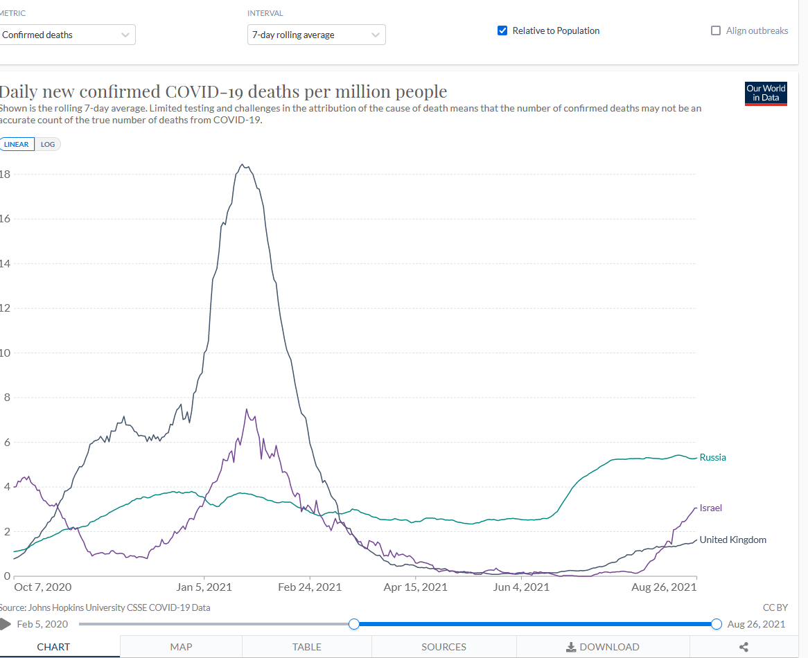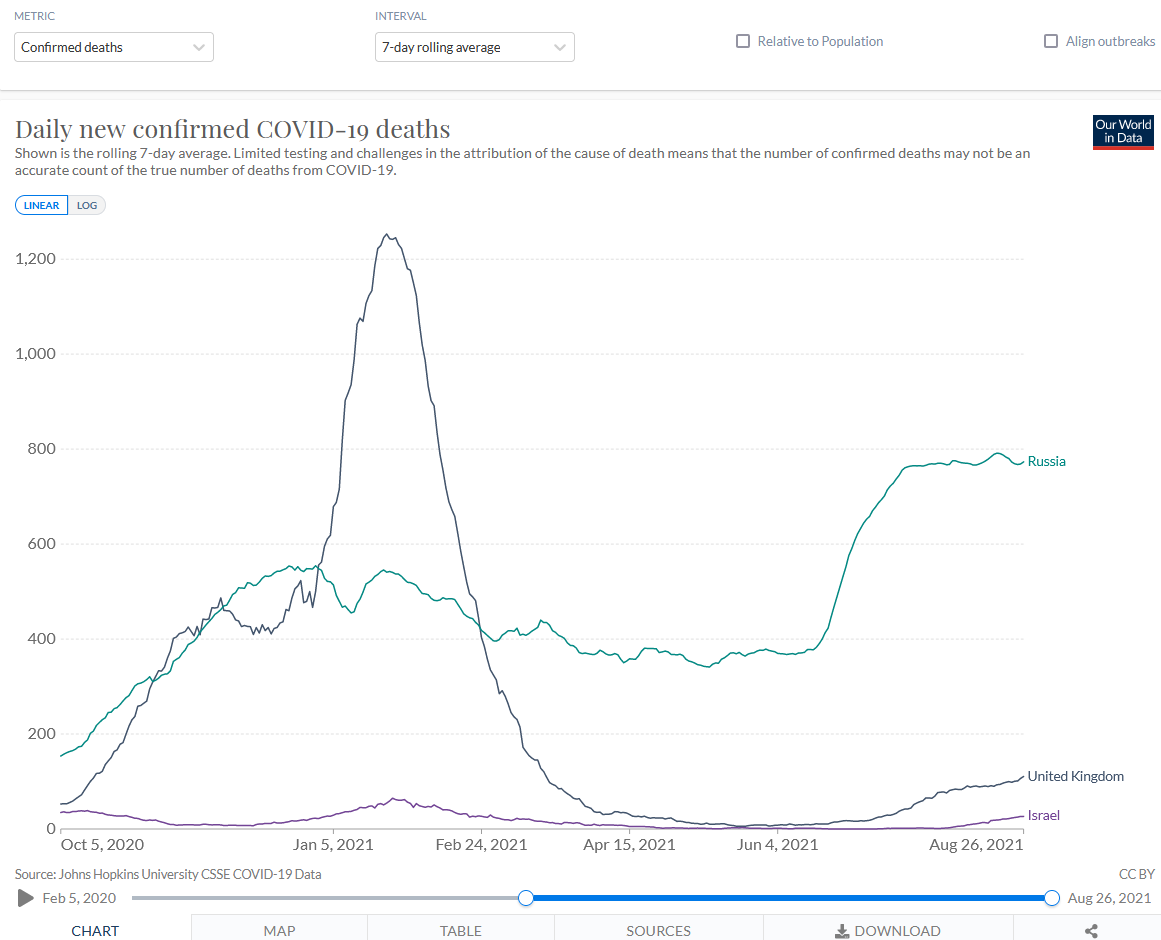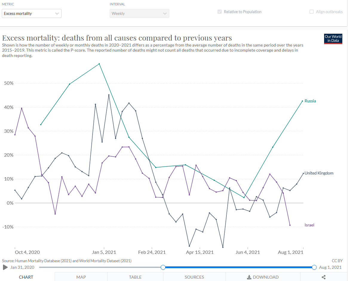Данные по российской излишней смертности на этом сайте неточны, так как основаны не на первоисточнике, а на новостных сайтах. Тем не менее, и из них виден разброс в излишней смертности, которая в Великобритании и Израиле в некоторые моменты даже опустилась ниже обычной (2015-2019 годов). Вообще надо отметить, что статистическое дело в России поставлено просто безобразно. Задержка в обновлении данных в Европе — неделя, а у нас Росстат выдаёт непонятно где (попробуйте найти эту страницу с главной), в каком-то странном виде данные в формате Excel, с месячными и более задержками и постоянными уточнениями.