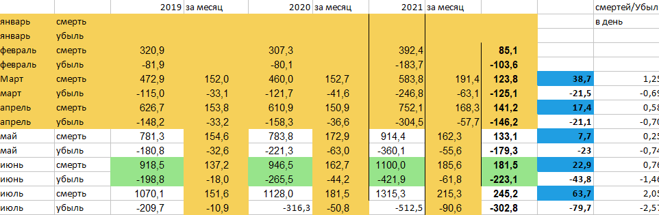 На данный момент — по сумме избыточной смертности/убыли за 2020 год (323,8 тыс. и 372,5 тыс. человек) и тех же данных за январь-июль 2021 года мы потеряли 245,2 тыс. человек умершими и убыль составила 302,8 тыс. человек. Таким образом, на конец июля мы уже потеряли 569 тысяч умершими и наша страна уменьшилась на 675,3 тыс. человек.