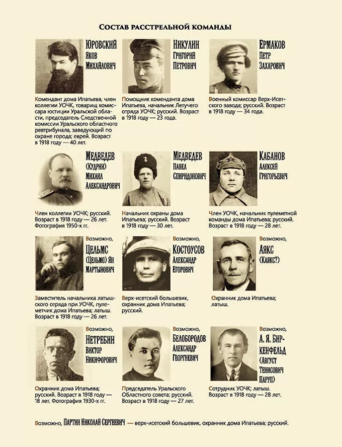Тогда же, вечером 16 июля, определили состав расстрельной команды. Юровский отобрал на дело «латышей» — так называли надзирателей из внешнего периметра охраны. Речь о двух прибалтах, венгре и четырех русских. Тем самым убийство царской семьи не было исключительно «делом рук евреев» — этот антисемитский миф активно тиражировали на протяжении десятилетий.