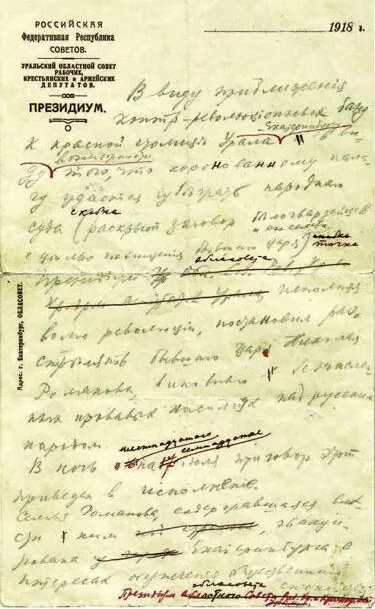 Но Белобородов торопится и поэтому берет в руки чернильное перо. Взгляд останавливается на фразе «раскрыт заговор белогвардейцев с целью похищения бывшего царя». «И его семьи», — добавляет чернилами чиновник. Затем поправляет еще несколько фраз, - рассказывает в своем материале Антон Скипунов.