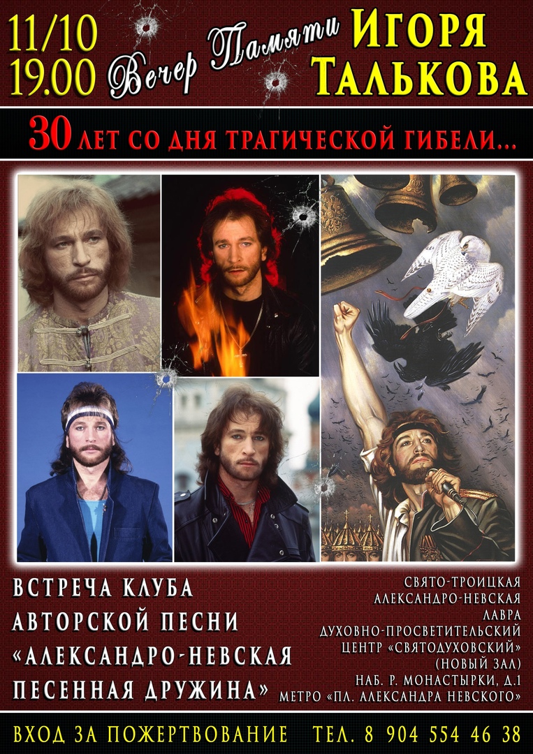 11 октября, в понедельник, в 19.00 в Святодуховском центре пройдет вечер памяти Игоря Талькова, вход свободный. Исполнять будут песни Игоря Владимировича многие известные музыканты. Затем, в ноябре, состоятся мероприятия, посвященные дню рождения Талькова.