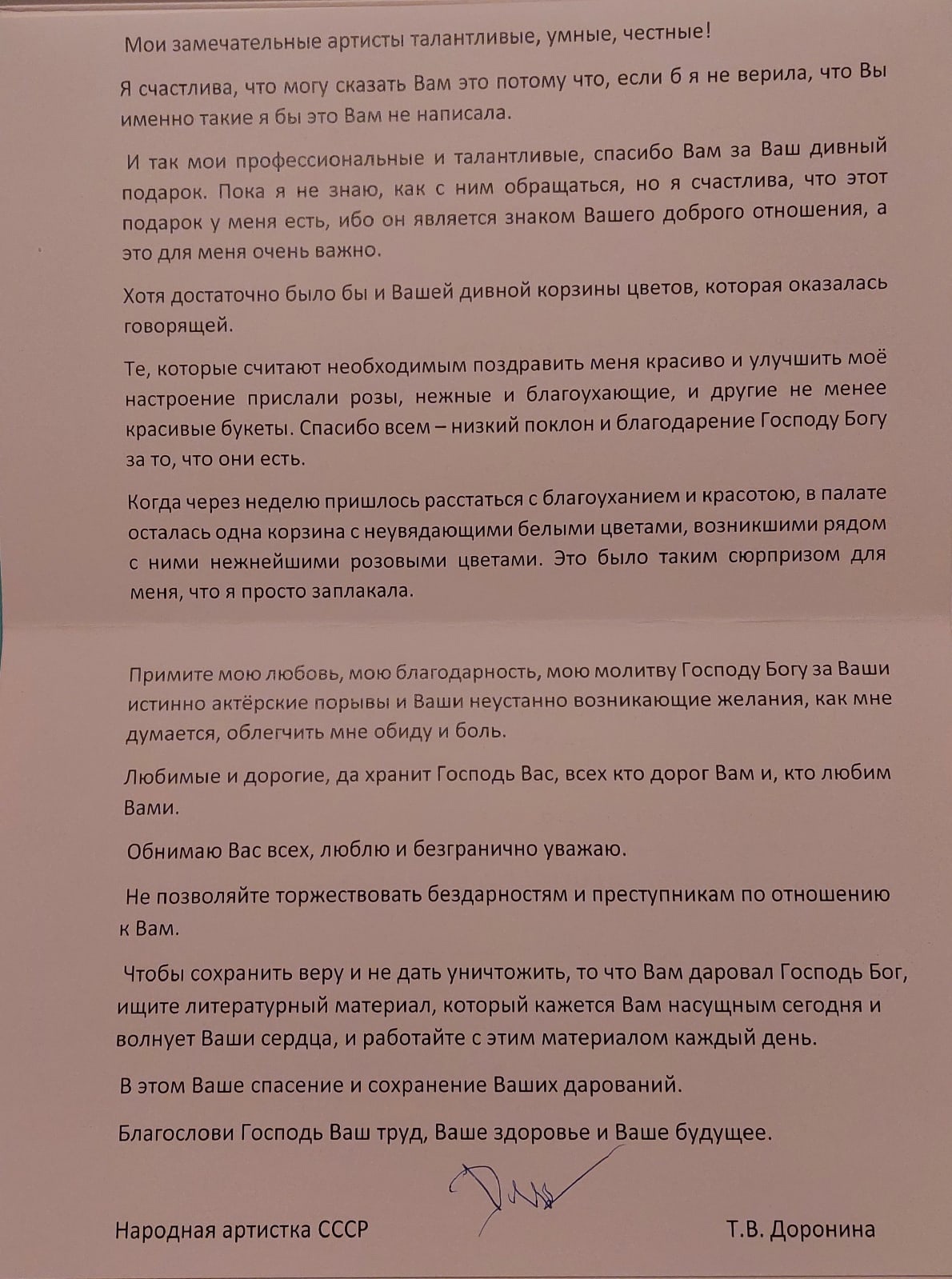 В заключение этой статьи мы позволим себе привести читателю то самое письмо Татьяны Васильевны Дорониной артистам, письмо датировано октябрем 2021 г.