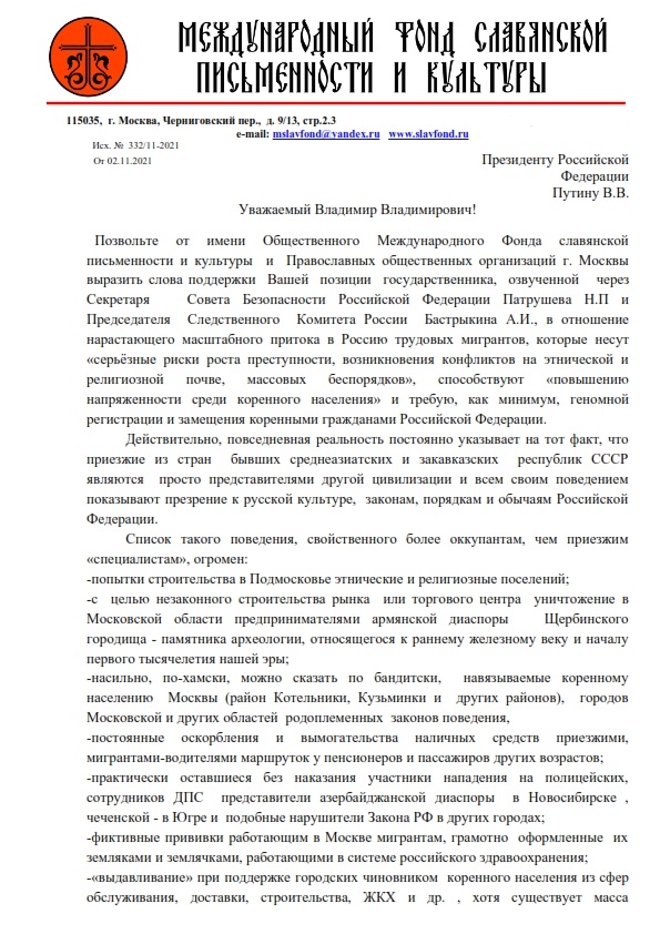 «Позвольте от имени Общественного Международного Фонда славянской письменности и культуры и Православных общественных организаций г. Москвы выразить слова поддержки Вашей позиции государственника, озвученной через Секретаря Совета Безопасности Российской Федерации Н.П.Патрушева и председателя Следственного Комитета России А.И.Бастрыкинав отношении нарастающего масштабного притока в Россию трудовых мигрантов, которые несут "серьёзные риски роста преступности, возникновения конфликтов на этнической и религиозной почве, массовых беспорядков", способствуют"повышению напряженности среди коренного населения" и требуют, как минимум, геномной регистрации и замещения коренными гражданами Российской Федерации», - говорится в обращении, поступившем в редакцию «Русской народной линии».