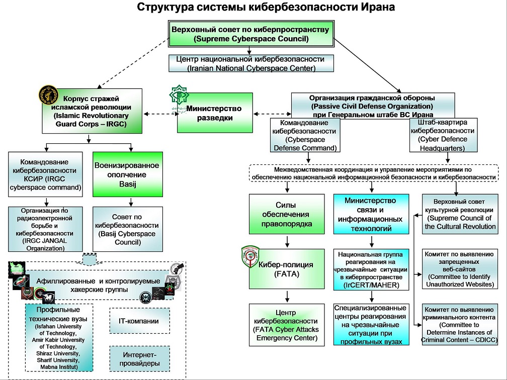 В марте 2012 г. высшим руководителем Ирана аятоллой Али Хаменеи было инициировано создание Верховного совета по киберпространству – структуры, определяющей и координирующей государственную политику в сфере кибербезопасности, возглавляемую президентом Ирана и формируемую из руководителей ключевых госструктур и ведомств – меджлиса (парламента), КСИР, Министерства разведки, Министерства науки, исследований и технологий, Министерства культуры, Министерства связи и информации, полиции, судебной системы, государственных телерадиокоммуникационных компаний, научных организаций. Известно также о создании в структуре Верховного совета по киберпространству Центра национальной кибербезопасности Ирана, который в настоящее время возглавляет Саид Махдиюн.