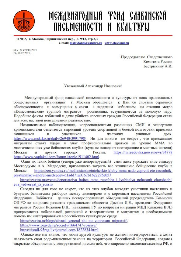 Международный фонд славянской письменности и культуры от лица православных общественных организаций Москвы обратился к главе Следственного комитета России Александру Ивановичу Бастрыкину со словами серьезной обеспокоенности и возмущения в связи с недавним избиением на станции метро «Комсомольская» группой мигрантов россиянина, вступившегося за молодую пару.