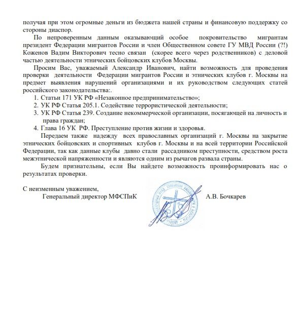Просим Вас, уважаемый Александр Иванович, найти возможность для проведения проверки деятельности Федерации мигрантов России и этнических клубов г. Москвы на предмет выявления нарушений организациями и их руководством следующих статей российского законодательства:.