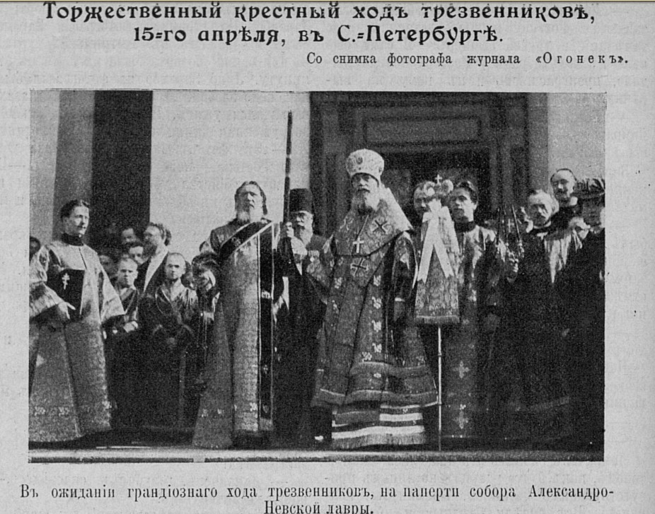 К празднику трезвости, который прошёл 23–24 сентября 1912 г., было отпечатано 500 000 экземпляров листков, объясняющих цель и значение «Праздника трезвости», 320 000 листков под названием «Правда об алкоголе и спиртных напитках», 240 000 листков под заглавием «Голгофский вопль». Было заказано 500 000 жетонов с надписью «Трезвость – счастье народа» по цене 4 р. за тысячу, пожертвования собирались в 3 000 кружек. 40 000 человек приняли участие в крестных ходах, в Петербурге 14 залов было предоставлено для чтения лекций на антиалкогольную тематику.