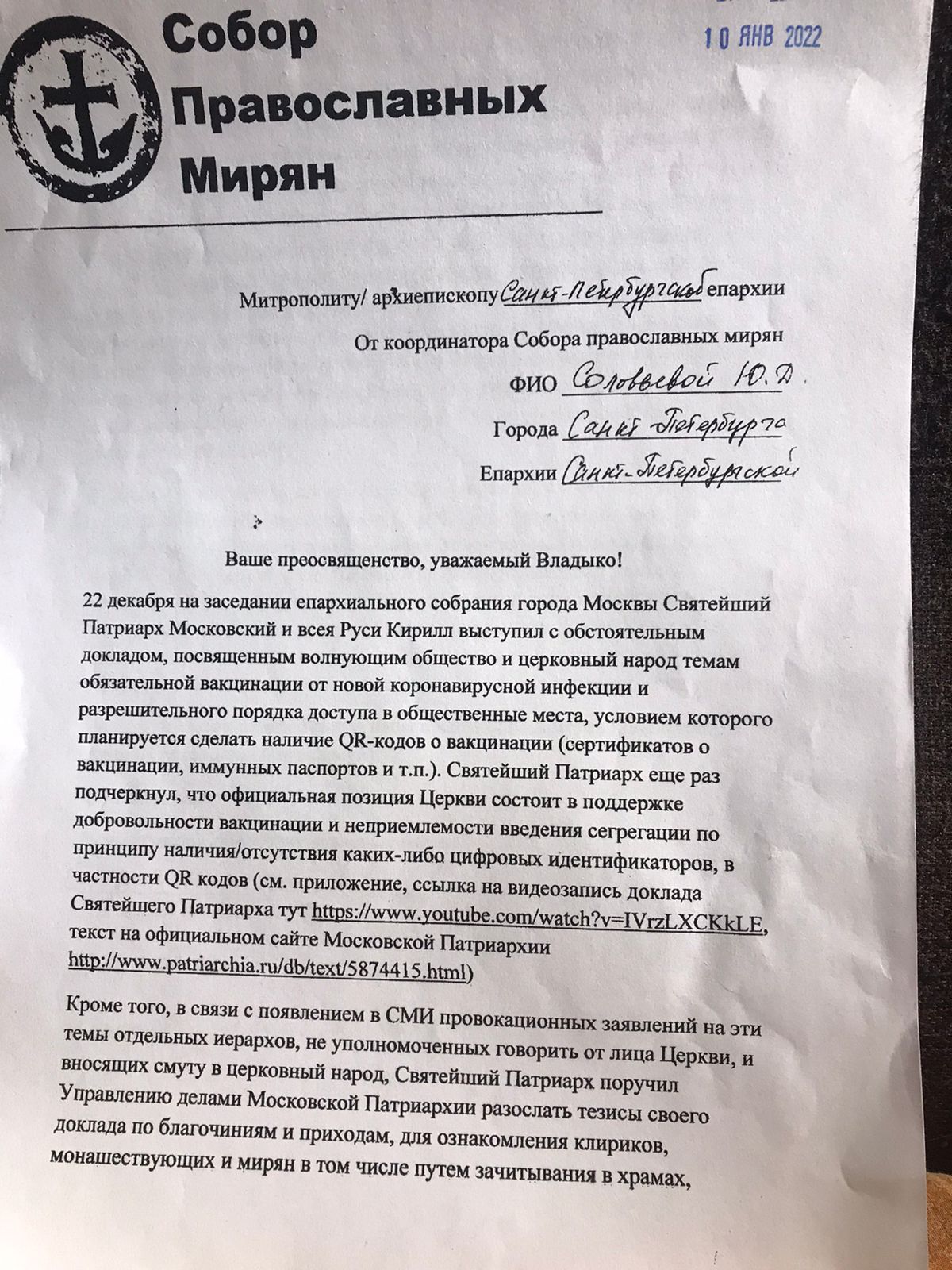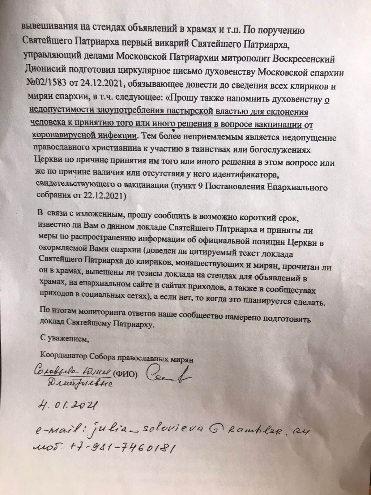 Я позвонил координатору некоего «Собора православных мирян», которая подписала это обращение, Юлии Соловьёвой. И задал ей вопрос: «А кто Вас уполномочил? Последовал ответ: «Никаких полномочий нет. Я сама по себе». «Но Вы же пишите от множественного числа, что "мы будем готовить". А мы – это кто?», – задал я ей вопрос. «Нет-нет, – ответила она мне, – я сама по себе. Я всего лишь член организации». «Но Вы же подписали обращение как координатор "Собора православных мирян", – продолжил я её расспрашивать. – То есть Вы занимаете какую-то должность и кто-то Вас уполномочил её занять? Кто Вас выбрал? Что это за организация?». Сразу пошли отказы: нет-нет, я ничего не знаю. По её словам, ей никто не давал никаких указаний. Мол, она увидела в интернете обращение и подписала его самостоятельно.