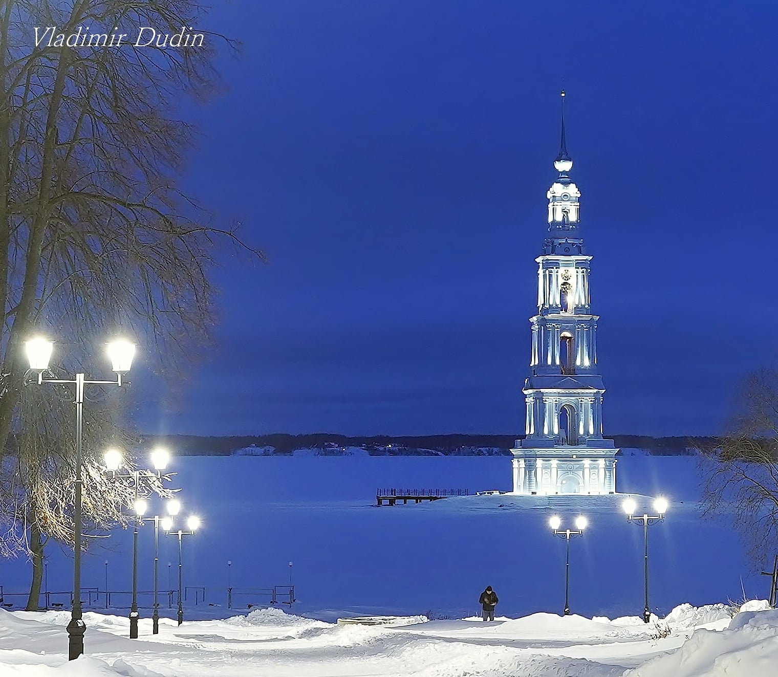 Фотограф Владимир Дудин в Фейсбуке демонстрирует свои интересные фотографии вечерней колокольни с подсветкой.