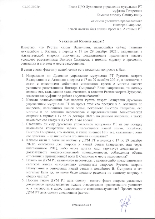 - Просим также ДУМ РТ дать оценку самого факта запроса указанных документов представителем ислама относительно православного усопшего и в частности, в адрес православного священнослужителя? Просим также ДУМ РТ дать оценку следующим фактам: