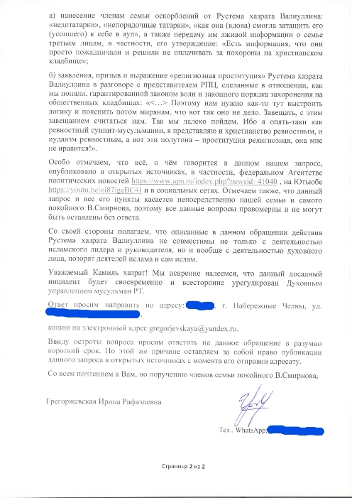 Наконец, в прошедшую пятницу 3 февраля 2022 г. семья обратилась с запросом лично к главе Духовного управления мусульман РТ муфтию Татарстана Камилю хазрату Самигуллину относительно действий «представителя муфтията» Рустама хазрата Валиуллина. В запрос включены и просьбы дать оценку оскорблениям им членов семьи вдовы покойного и его памяти.