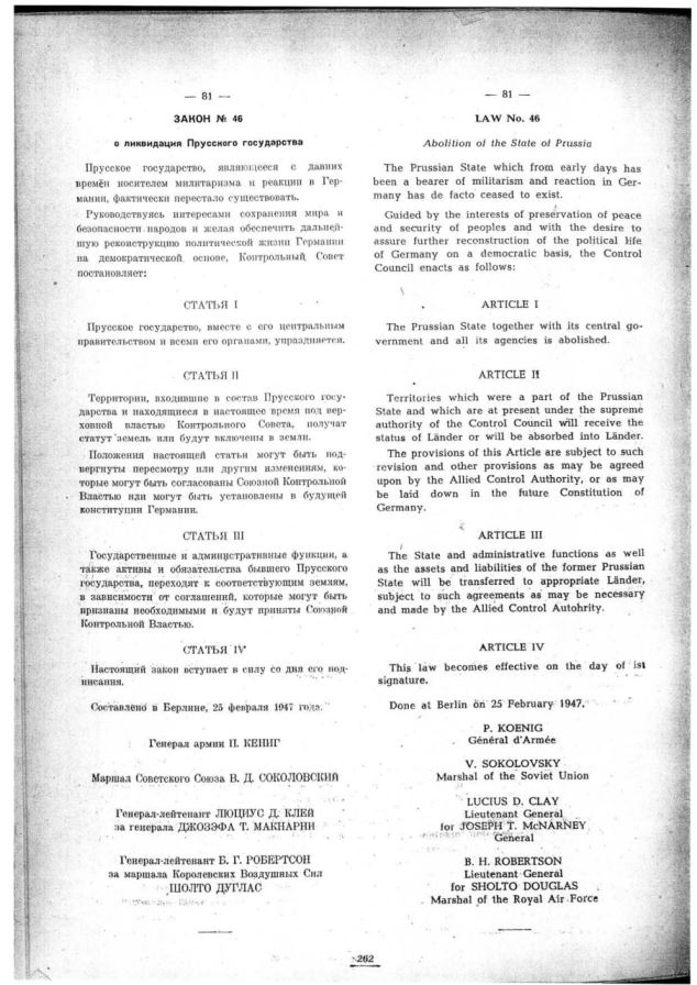 «Прусское государство, с давних времён являвшееся носителем милитаризма и реакции в Германии, фактически перестало существовать».