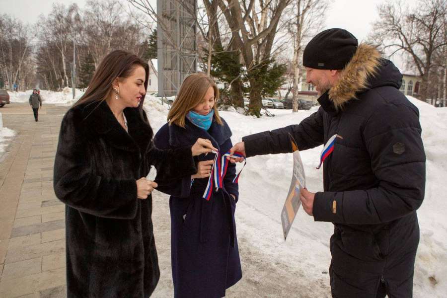 Один из участников акции также общался с прохожими, раздавал им ленточки в цвет российского триколора.