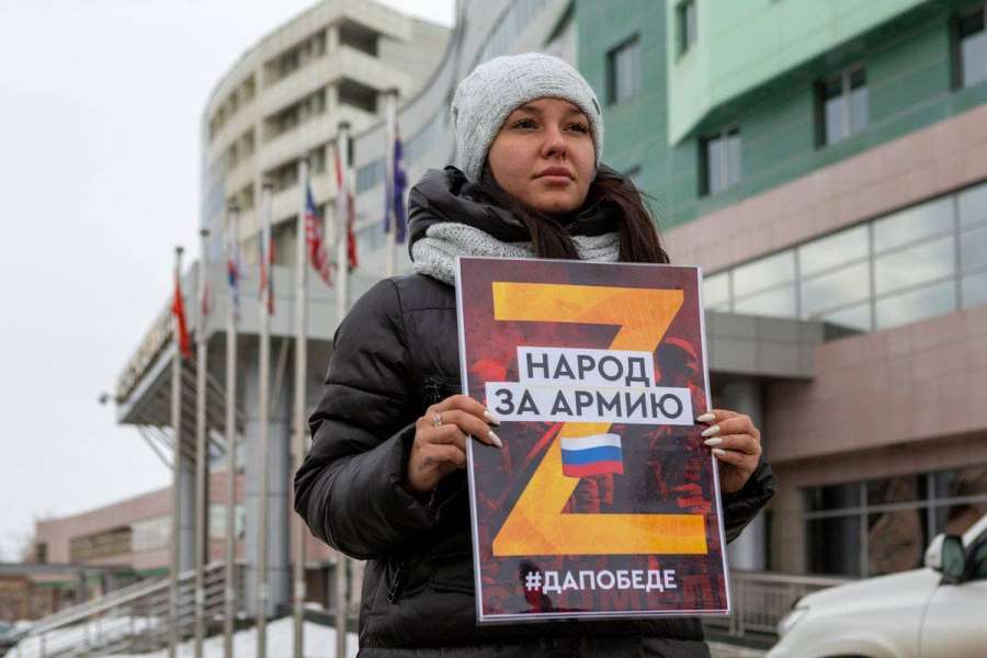 На плакатах в руках у горожан написано: «Слава русскому воинству», «Народ за армию. #ДАПОБЕДЕ», а также изображён знак Z.