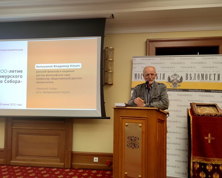 Доктор философских наук, профессор, общественный деятель Владимир Ильич Большаков свой доклад посвятил теме «Земский Собор – путь преодоления Смуты». Докладчик рассказал о своем понимании симфонии властей, о роли Земского собора в возрождении монархии.