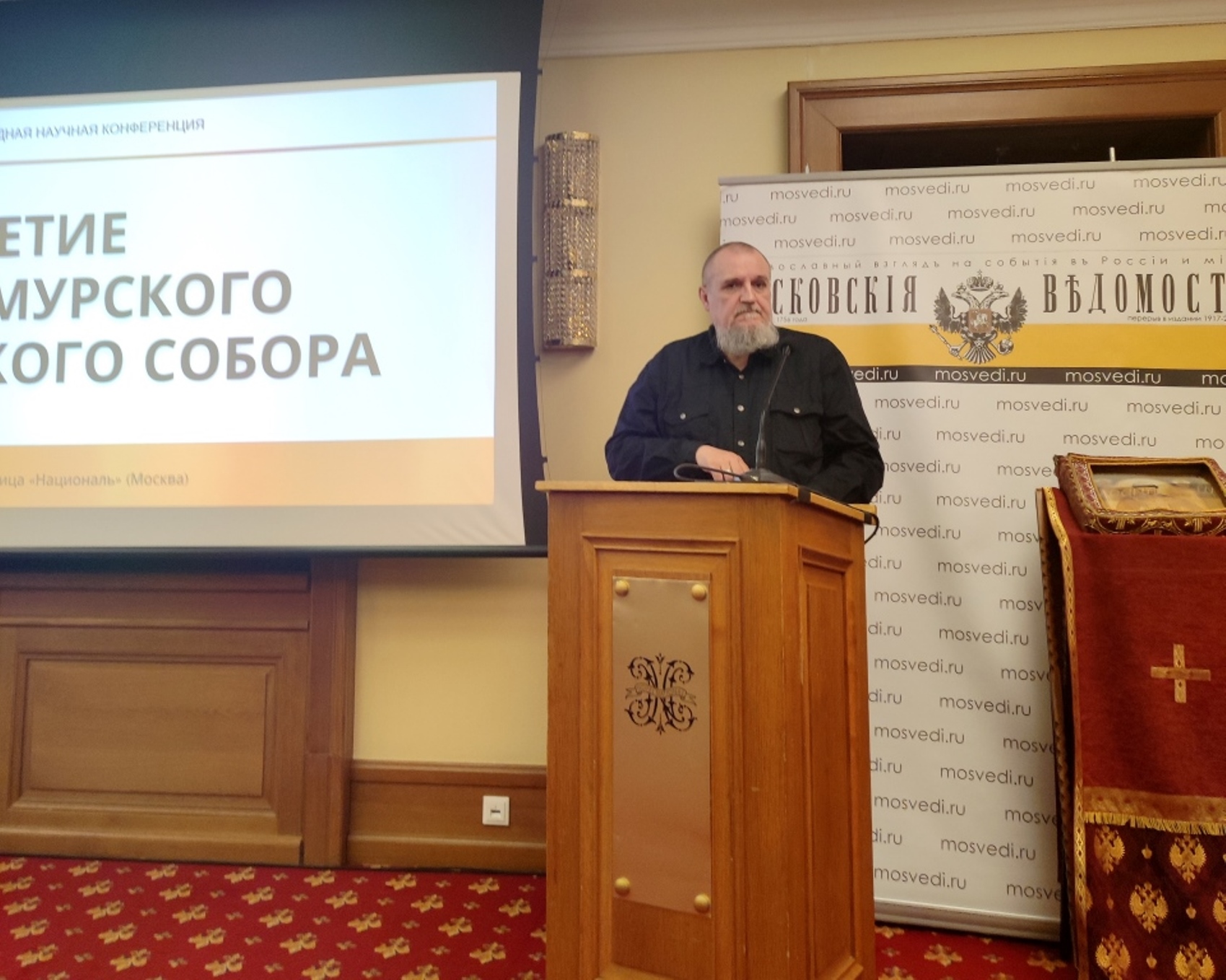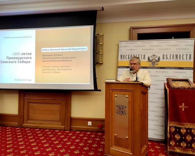 Президент Русского Просветительного фонда имени святителя Василия Великого Василий Вадимович Бойко-Великий выступил с докладом на тему «Генерал Михаил Дитерихс – руководитель Приамурского Земского Собора». Главное внимание докладчик сконцентрировал на роли генерала М.К. Дитерихса в расследовании убиения Царской Семьи.