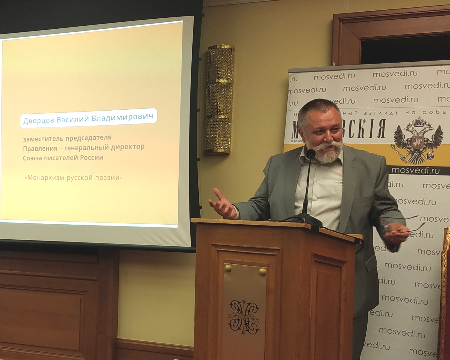 Заместитель председателя Правления – генеральный директор Союза писателей России Василий Владимирович Дворцов выступил с поэтическим докладом «Монархизм русской поэзии», который вызвал восхищённые аплодисменты собравшихся.