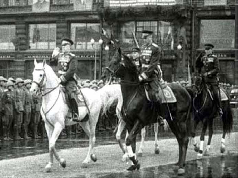 Маршал Советского Союза Георгий Константинович Жуков, принимавший Парад Победы, вспоминал об этих торжественных минутах: «Без трех минут десять я был на коне у Спасских ворот.