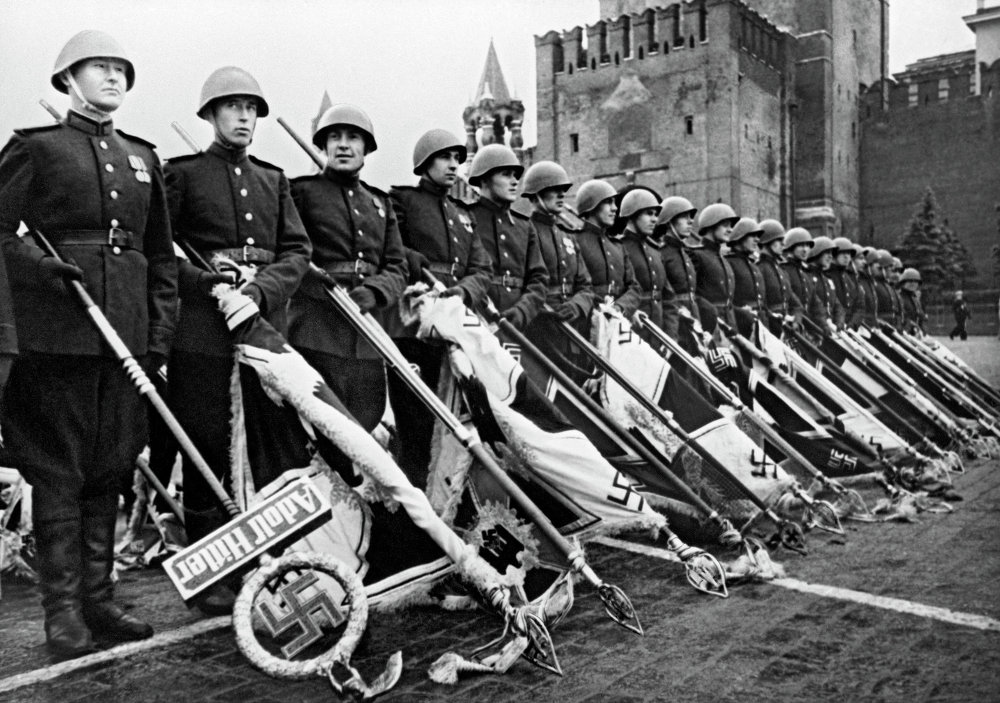 Из Берлина привезли Красное знамя, которое было водружено над рейхстагом, а также боевые знамена поверженных фашистских войск, захваченные нашими воинами.