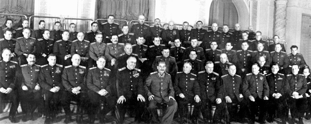 На приёме в Кремле. Верховный главнокомандующий Иосиф Виссарионович Сталин и полководцы Победы