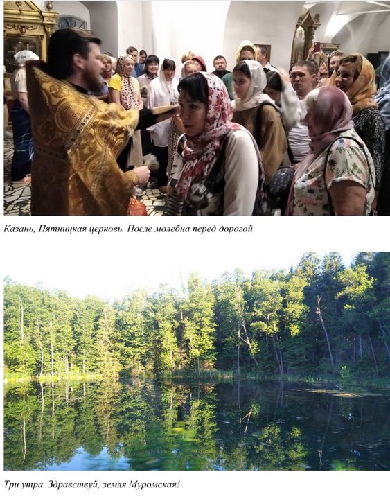 Организатор нашей паломнической поездки Наталья до нас многажды собирала паломников в Дивеево из Казани. Но в этот раз впервые решилась ехать туда через Муром, дабы мы приобщились муромских святынь, среди которых запланировано посещение Свято-Троицкого женского монастыря, в главном одноимённом храме которого покоятся мощи святых благоверных князей Петра и Февронии Муромских, и памятника им же, Благовещенского мужского монастыря, памятника Илие Муромцу на высоком берегу р. Ока, часовни и святого ключа Илии Муромца с купелью. Идея заманчивая сама по себе, поскольку, как говорили, до Мурома расстояние и время пути из Казани почти такое же, как до Дивеева, а между ними потом ещё часа три, так что в один день, если с раннего утра прибыть в Муром, то можно и там всё основное успеть, и в Дивеево к вечерней прибыть.