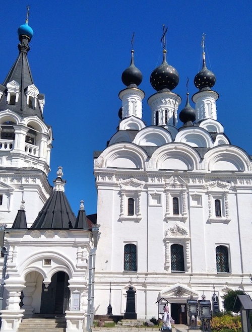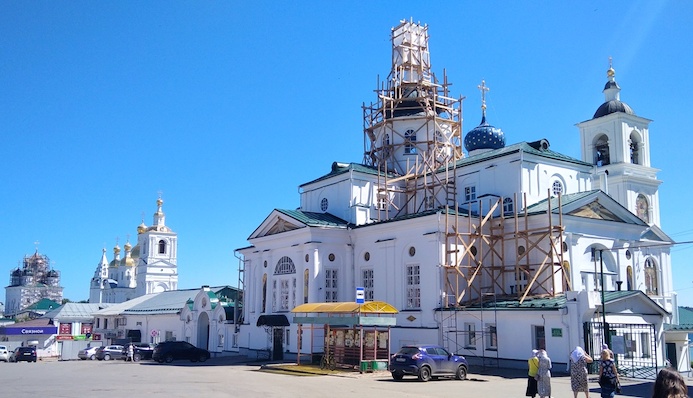 День бы целый провести в этом замечательном городе, в котором всё дышит русской стариной, но у нас лишь час или два. Сам Воскресенский собор сейчас на реставрации, направляемся в Никольский женский монастырь и его храм Богоявления, в нижней части которого устроен храм в честь иконы «Всех скорбящих радость». Среди прочих святынь обители обращает на себя внимание образ Богородицы "Избавление от бед страждущих" в этом храме. Икону эту сберегли обычные люди и когда восстанавливался монастырь принесли сюда. Была она тогда в 80-х совсем чёрная, но постепенно без механического вмешательства сначала стала фрагментами проявляться, и потом по молитвам сестёр монастыря полностью высветлилась. Почитается эта икона как чудотворная и особую помощь приносит тем обращающимся к ней, кто подвергся незаконным и несправедливым преследованиям. Очень актуально в наше время, когда репрессии и произвол силовиков, а иногда и судов - зашкаливает, старики говорят, что хуже было только между революцией и Великой Отечественной.