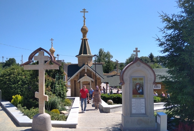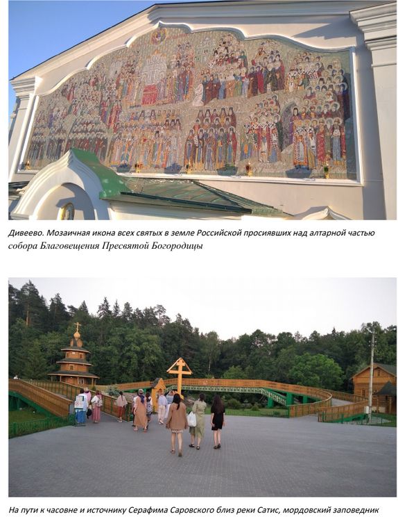 После богослужения до вечерней трапезы оставалось ещё время - пошли на "канавку". Я предыдущий первый раз был здесь почти тридцать лет назад, и сейчас реальное углубление-канавка переоборудована наоборот в насыпь с мостовой и перилами. Многие идут босиком. Как и положено, обходя "канавку" прочли и мы 150 раз "Богородице, дево...", остаток пути эту молитву просто пели, и вдруг... Открывается вид с одной стороны канавки – на деревянную чудо-церковь с золотыми крестами, буквально пылающими семью "солнцами", а с другой - каменный Благовещенский собор с огромным над алтарной частью мозаичным панно-иконой всех русских святых, которым на вечерней только что служили праздник! Уже потом, вернувшись домой, я обыскался – что же это за чудо-церковь была с пылающими закатным солнцем семью крестами? С трудом отыскал – это часовня Царственных страстотерпцев, а семь куполов с крестами – по числу Царственных страдальцев. Сюда к лиственнице, которую сестры монастыря посадили ещё в 1904 году в честь рождения наследника российского престола — царевича Алексея, много лет приходили т богомольцы, стихийно приносились иконы.