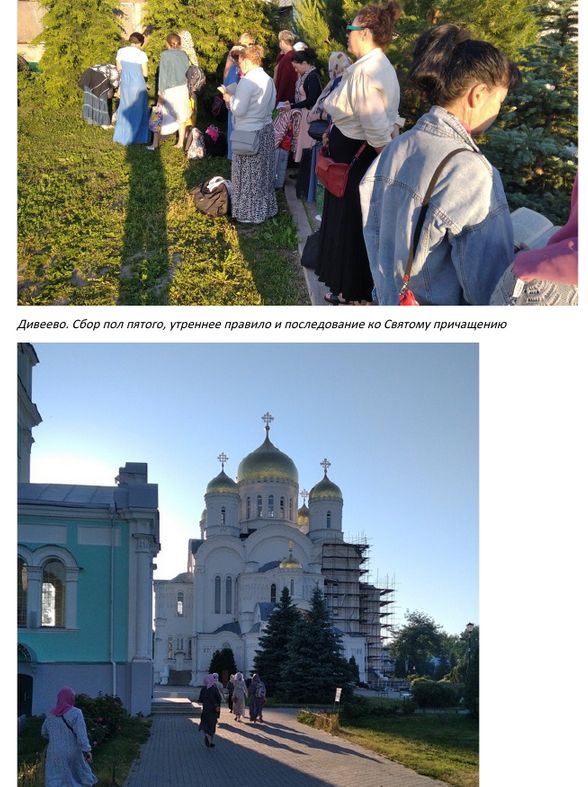 Один совет тем, кто готовится к исповеди и причастию в Дивееве. Лучше писать грехи и подать записку с ними священнику на индивидуальной исповеди, не устно - так будет сэкономлено драгоценное время, ведь можешь получить и такой духовный совет: обстоятельно исповедаться в другом месте и в другое время, не в воскресный день в Дивееве. А исполнение правил подготовки к причастию - безусловны, это пост и молитвы с канонами, посещение вечернего богослужения накануне.