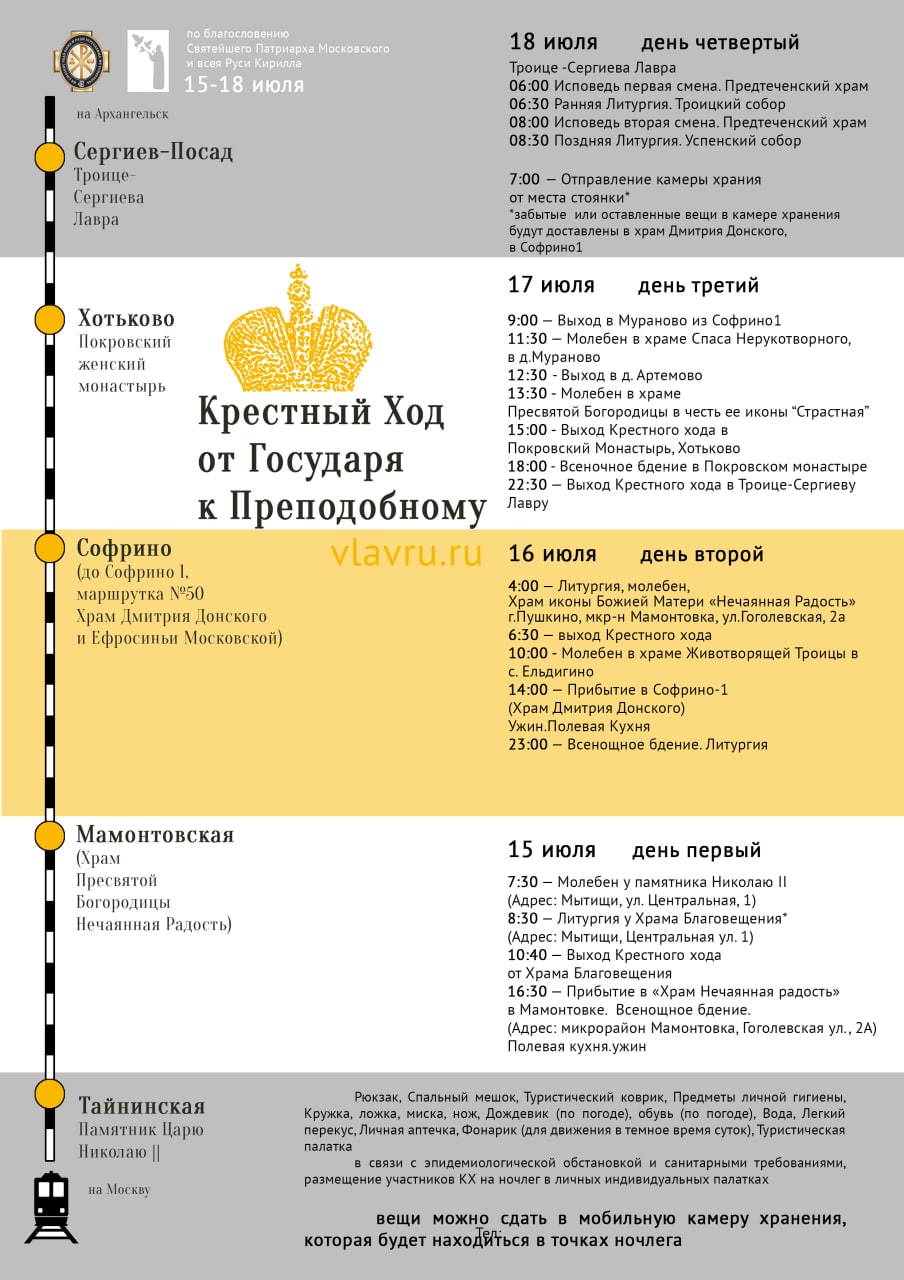 Крестный ход совершается в течение четырех дней (с 15-го по 18-е июля) и традиционно начнётся молебном у памятника Государю императору Николаю II в бывшем селе Тайнинском 15 июля в 7-30. Затем, после Божественной Литургии в храме Благовещения Пресвятой Богородицы, участники крестного хода направятся древним паломническим путём через поселок Пирогово, г. Пушкино, село Ельдигино, поселки Софрино I, Мураново, деревню Артёмово в Хотьковский Покровский женский монастырь, где почивают мощи родителей преподобного Сергия преподобных Кирилла и Марии. Известно, что сам преподобный в свое время завещал: прежде, чем идти к нему, помолиться об упокоении его родителей над их гробом. А из Хотьково наш путь будет лежать уже к Преподобному Сергию.